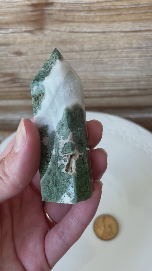 Flower Agate Crystal Tower with Mossy Caves and Inclusions