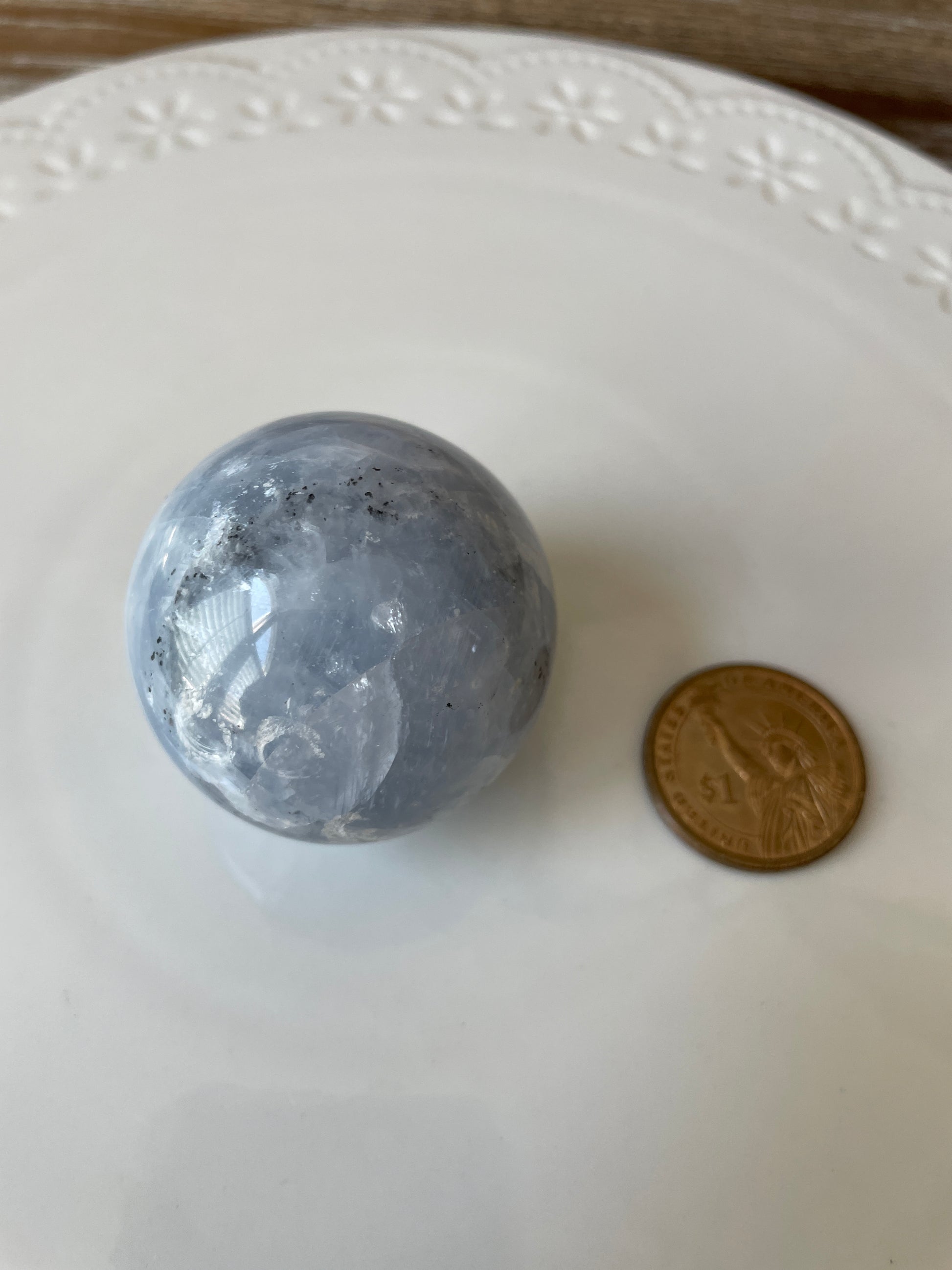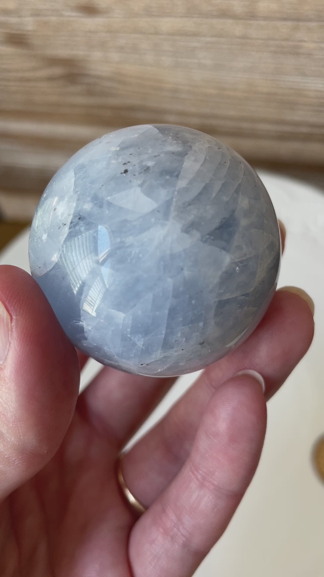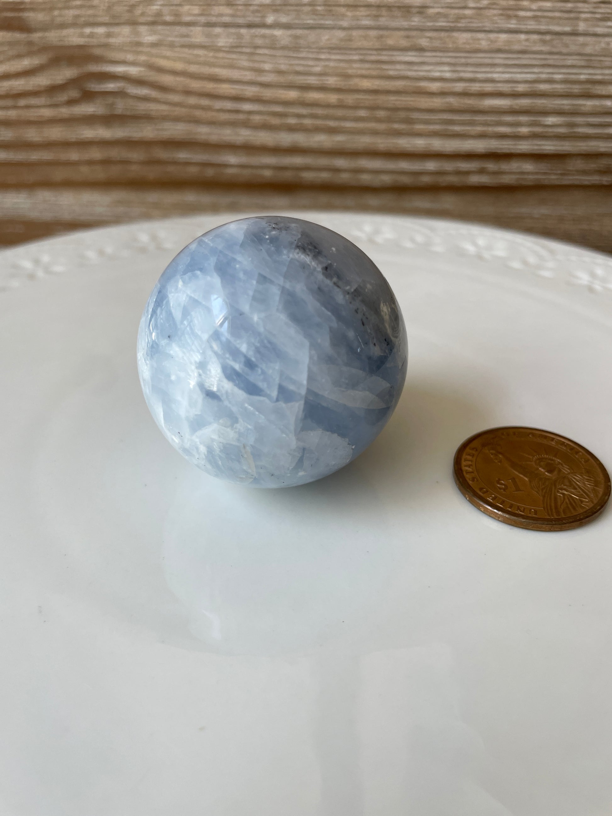 • Hand-polished Blue Calcite sphere, radiating gentle, tranquil energy that promotes emotional healing and relaxation.