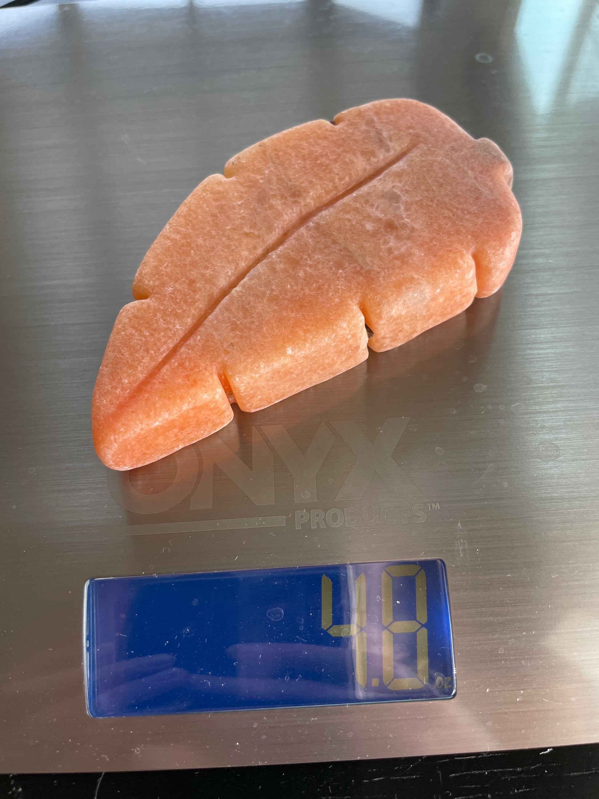 This chunky hand-carved orange calcite leaf crystal is the perfect statement piece for your desktop or altar.