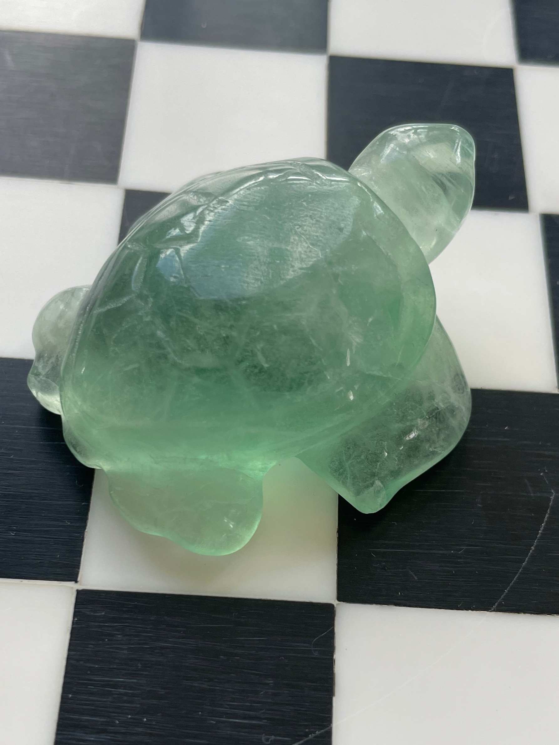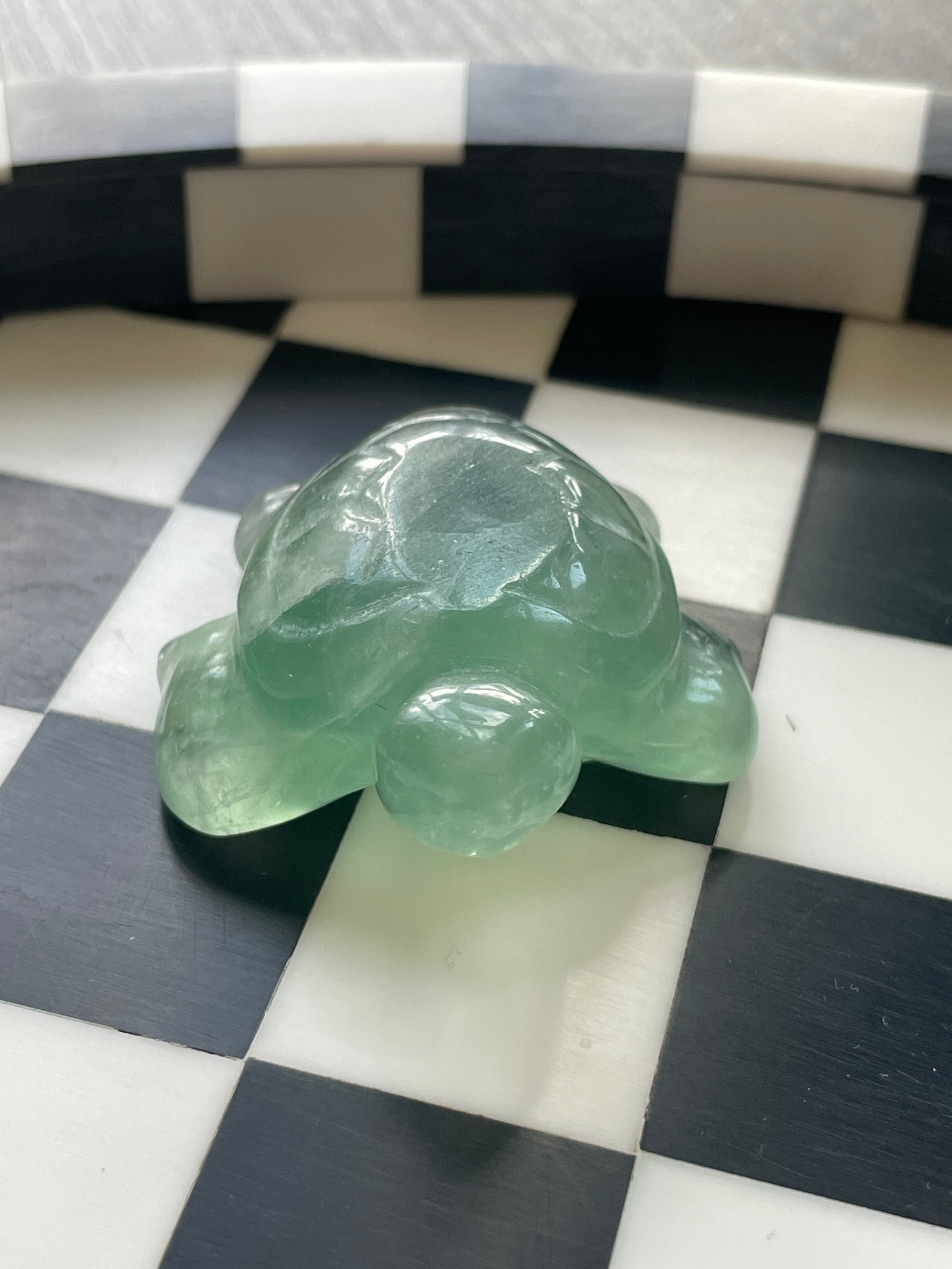 • Green fluorite is believed to absorb negative energy, promote heart-centered healing, and enhance mental clarity, while turtles symbolize longevity, patience, and wisdom.