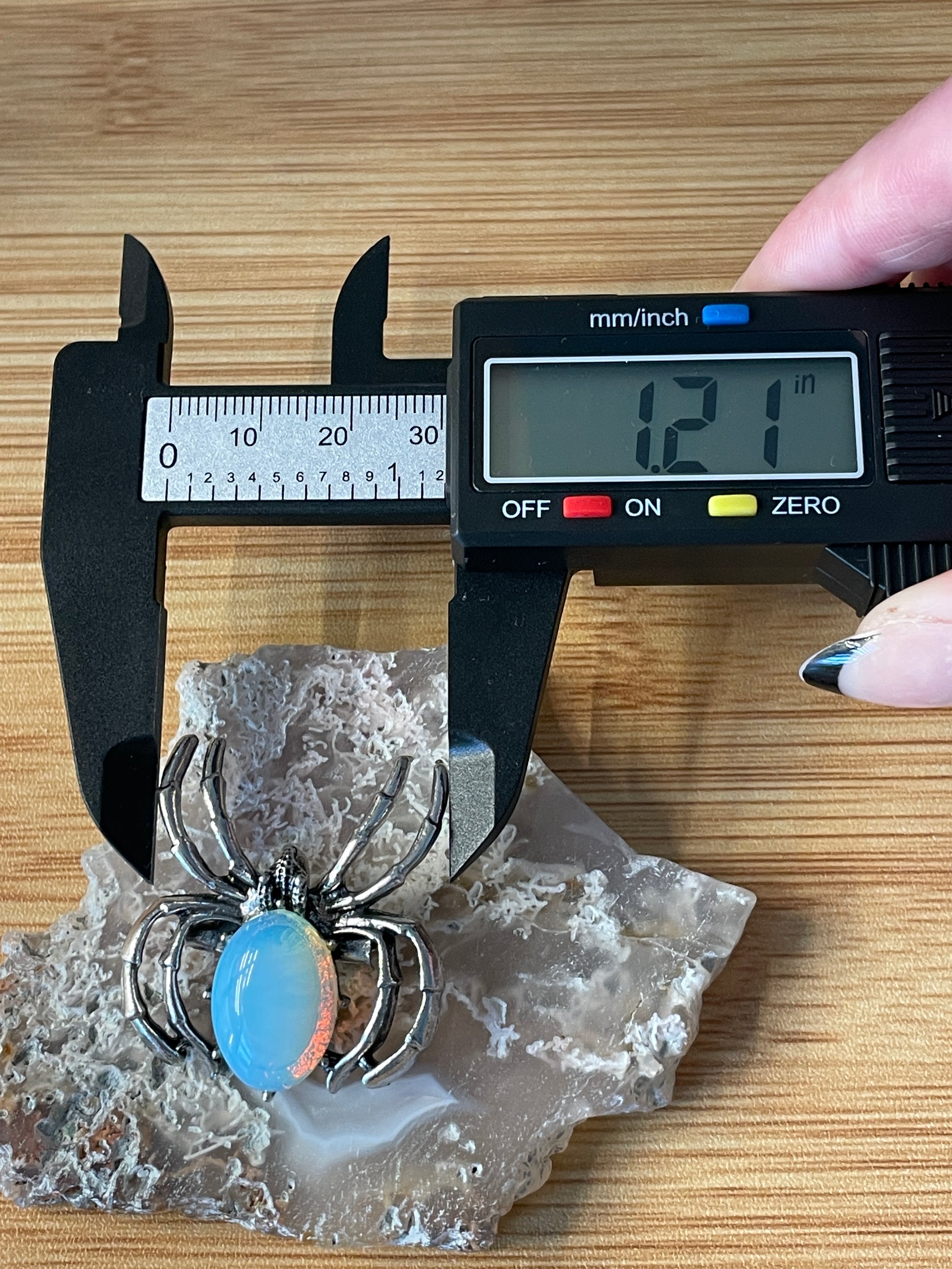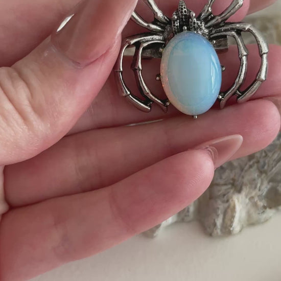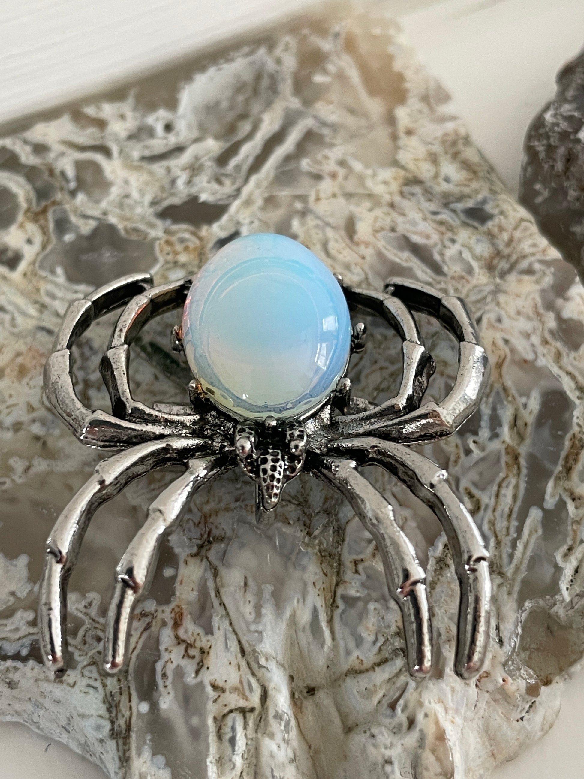 • Handcrafted silver-plated spider pendant pin featuring an opalite body that shimmers with ethereal blue and gold hues.