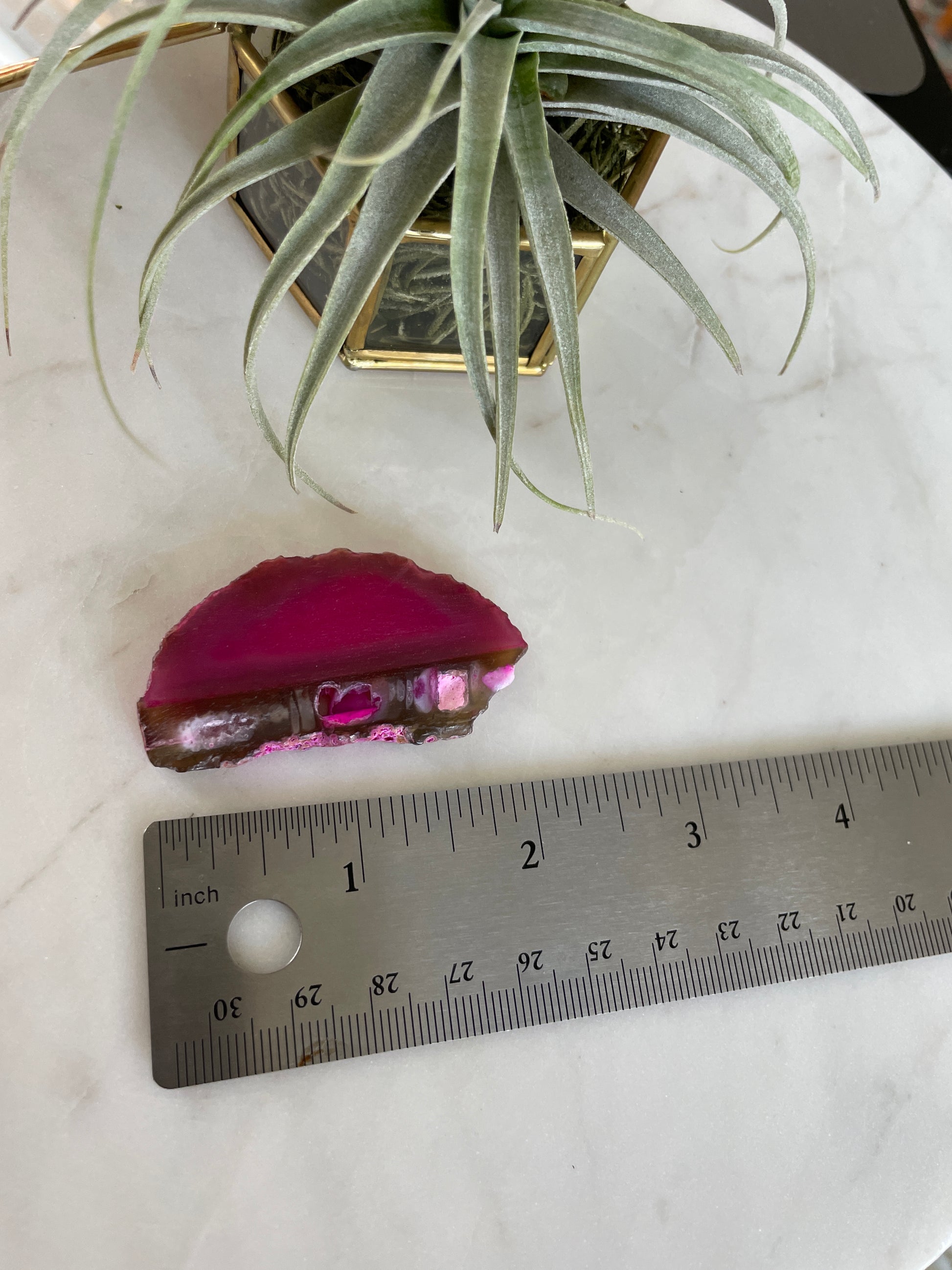 This vivid pink agate slab/slice features druzy pockets and portals. Measures approximately 2 inches long.