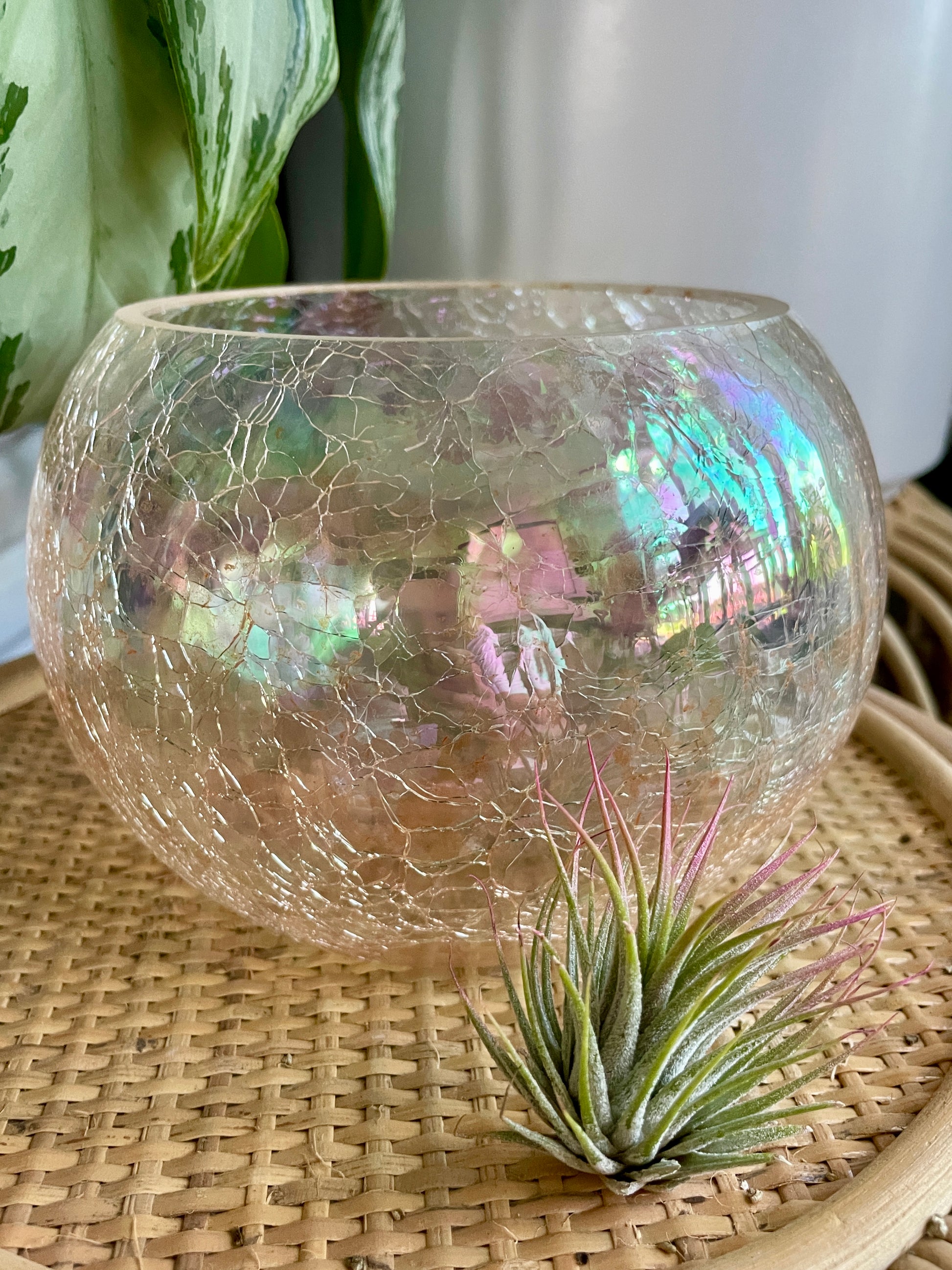 This upcycled crackle glass bowl with pearly pink/coral iridescence makes a perfect houseplant planter.