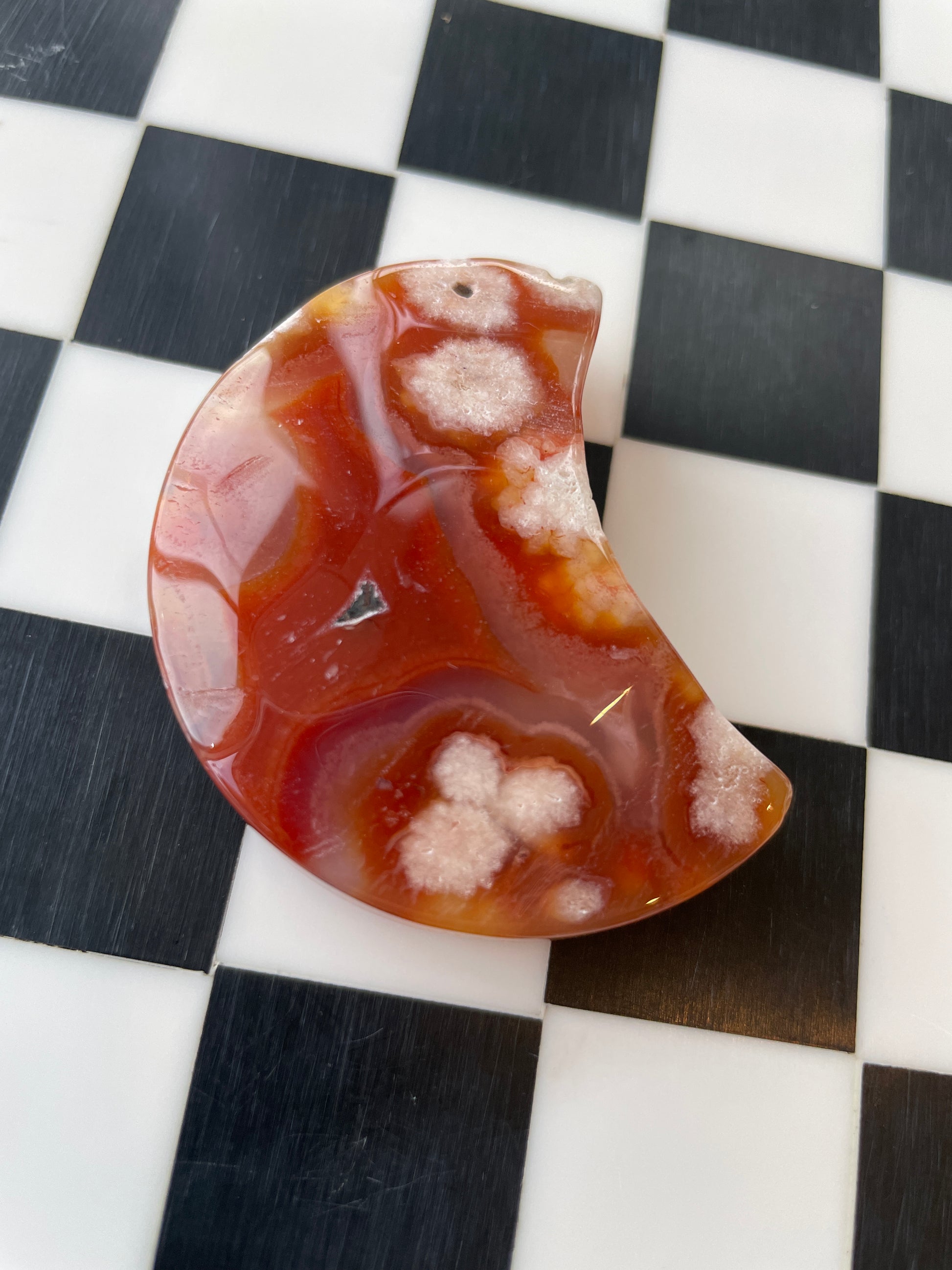 This distinctive hand carved Red Carnelian and Flower Agate Moon showcases stunning red banding with white and beige floral patterns with druzy caves.