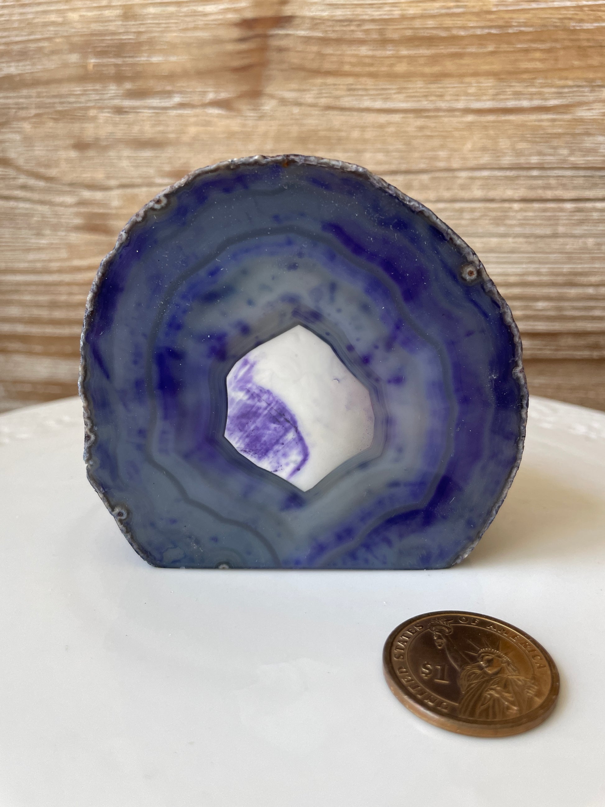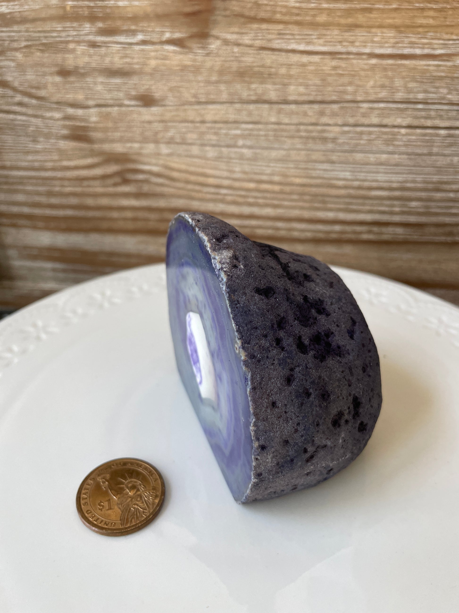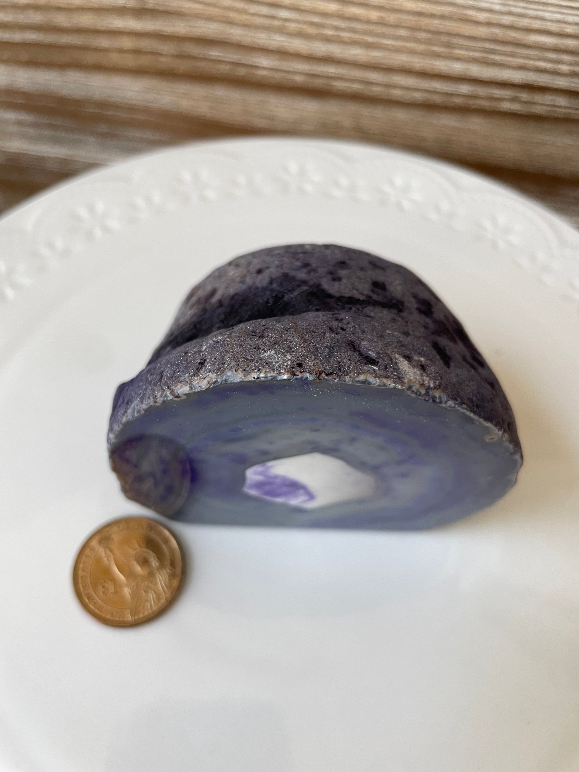 Chunky violet dyed agate slab from Brazil. This piece features translucent violet and blue banding on its polished surface with a milky white eye in the center. The back of the slab is raw and sparkles dazzlingly in natural light.