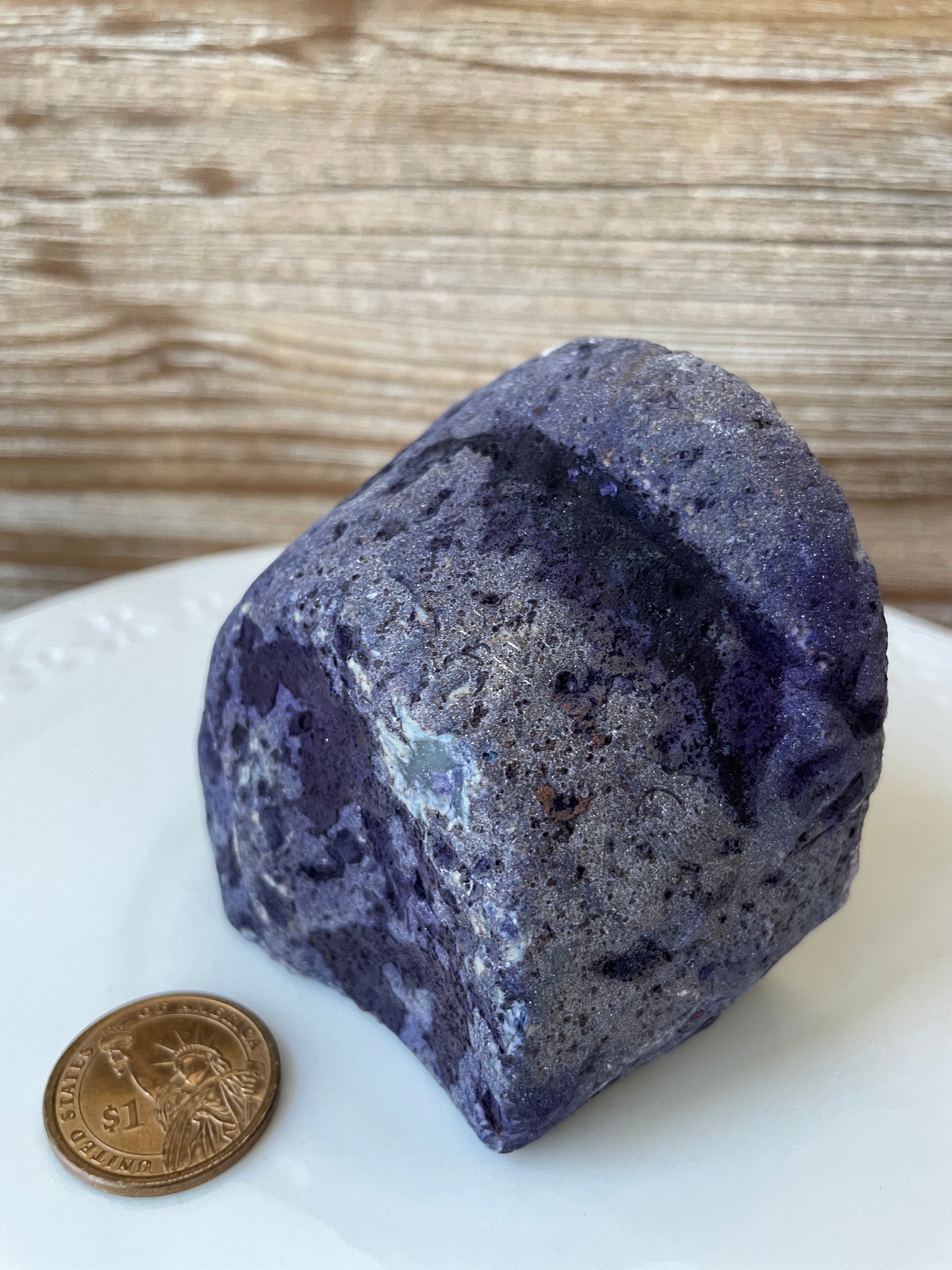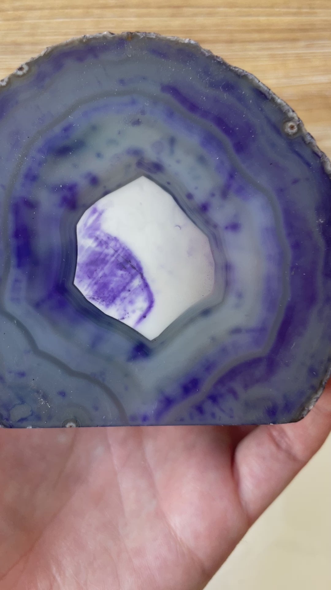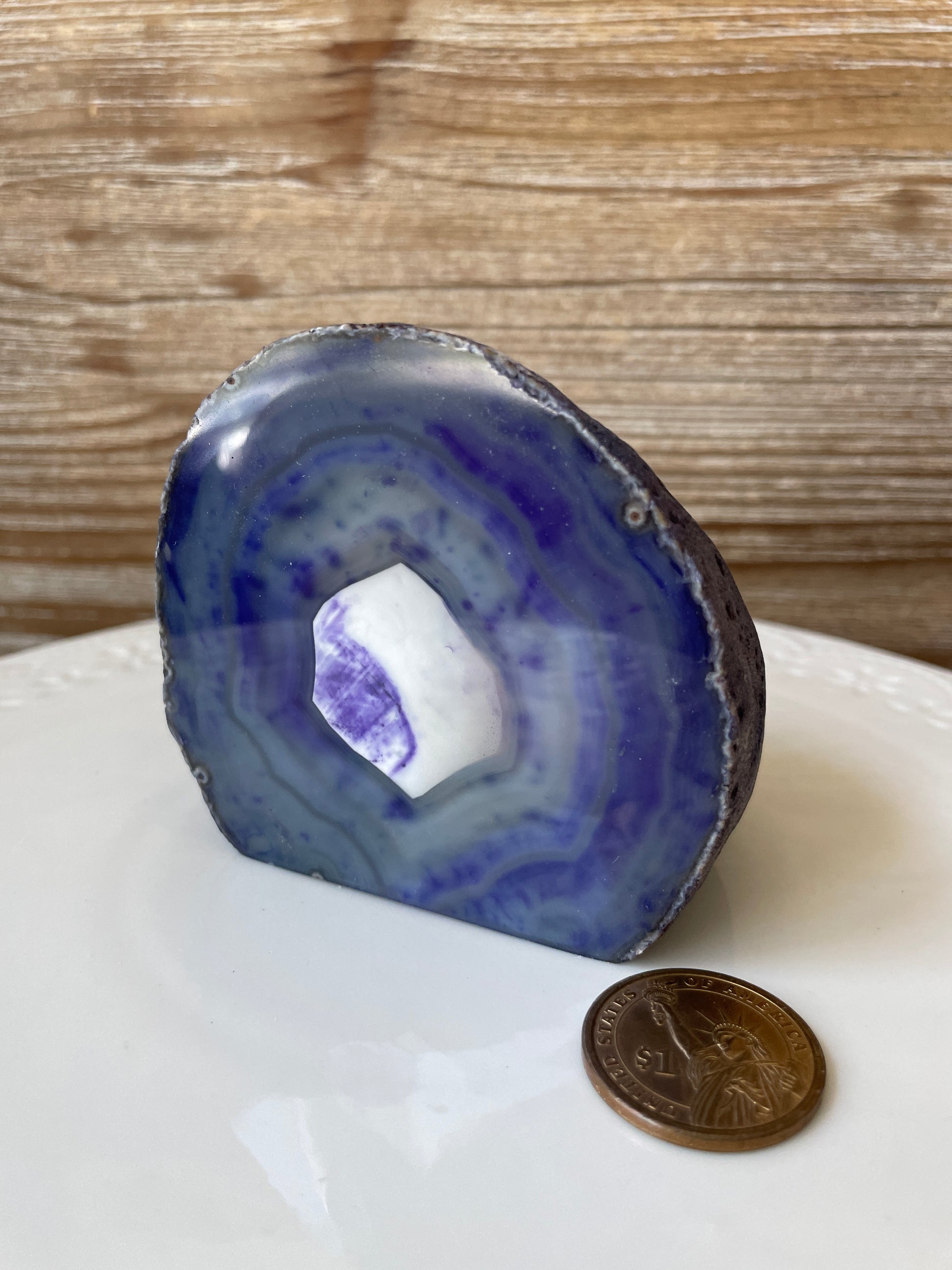 Chunky violet dyed agate slab from Brazil. This piece features translucent violet and blue banding on its polished surface with a milky white eye in the center. The back of the slab is raw and sparkles dazzlingly in natural light.