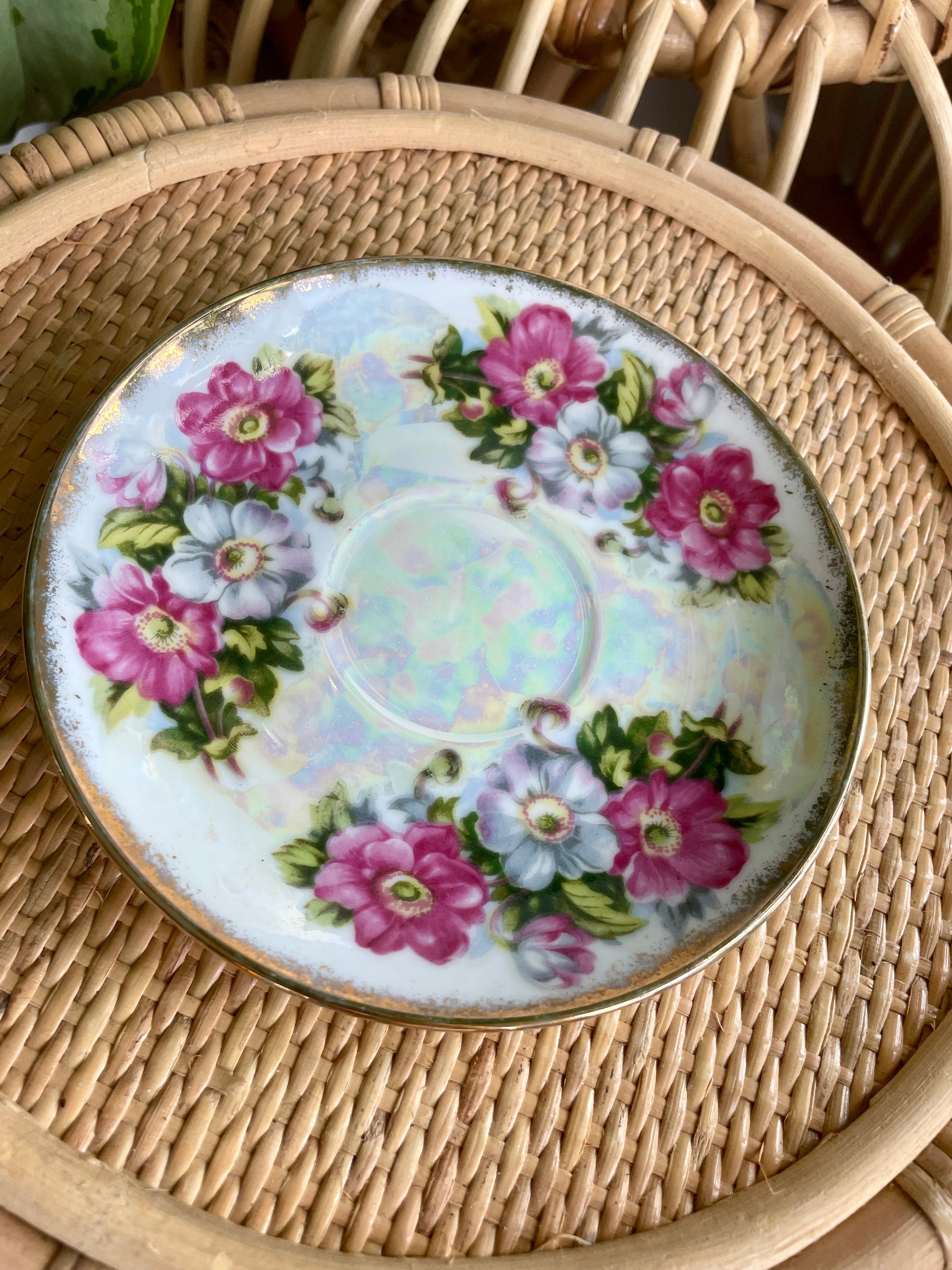 A white iridescent fine china teacup saucer with a floral design and gold decoration. The saucer measures 5.5" wide. The rim is gold trimmed.